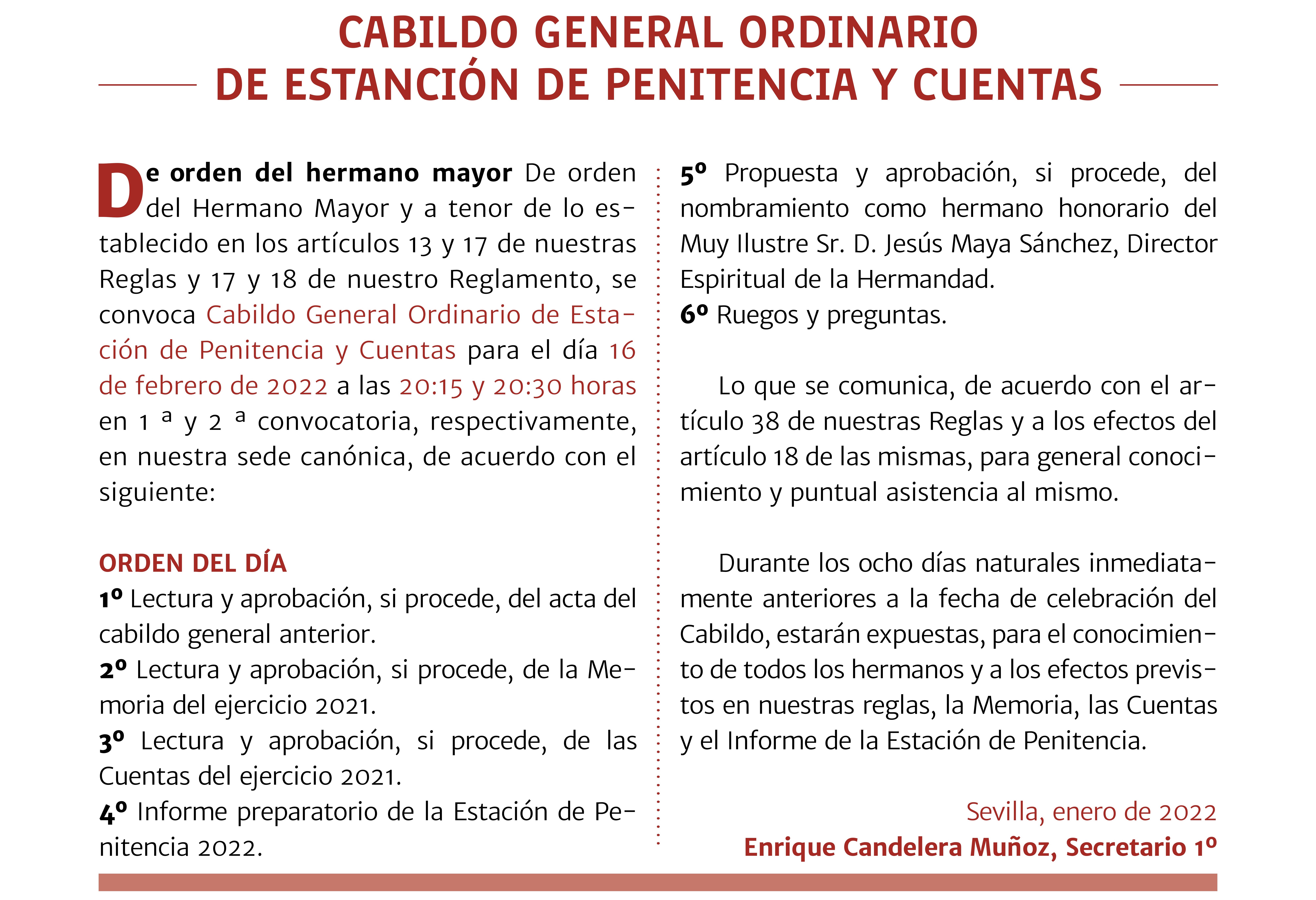 Cabildo General Ordinario de Estación de Penitencia y Cuentas