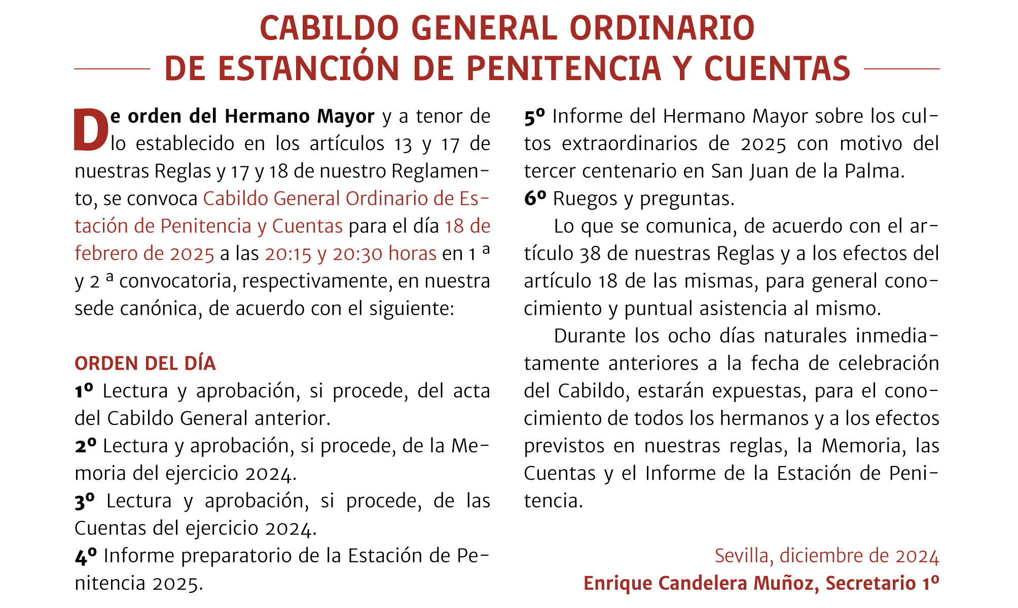 Cabildo General Ordinario de Informe de Estación de Penitencia, Seguimiento de Cultos y de Presupuestos