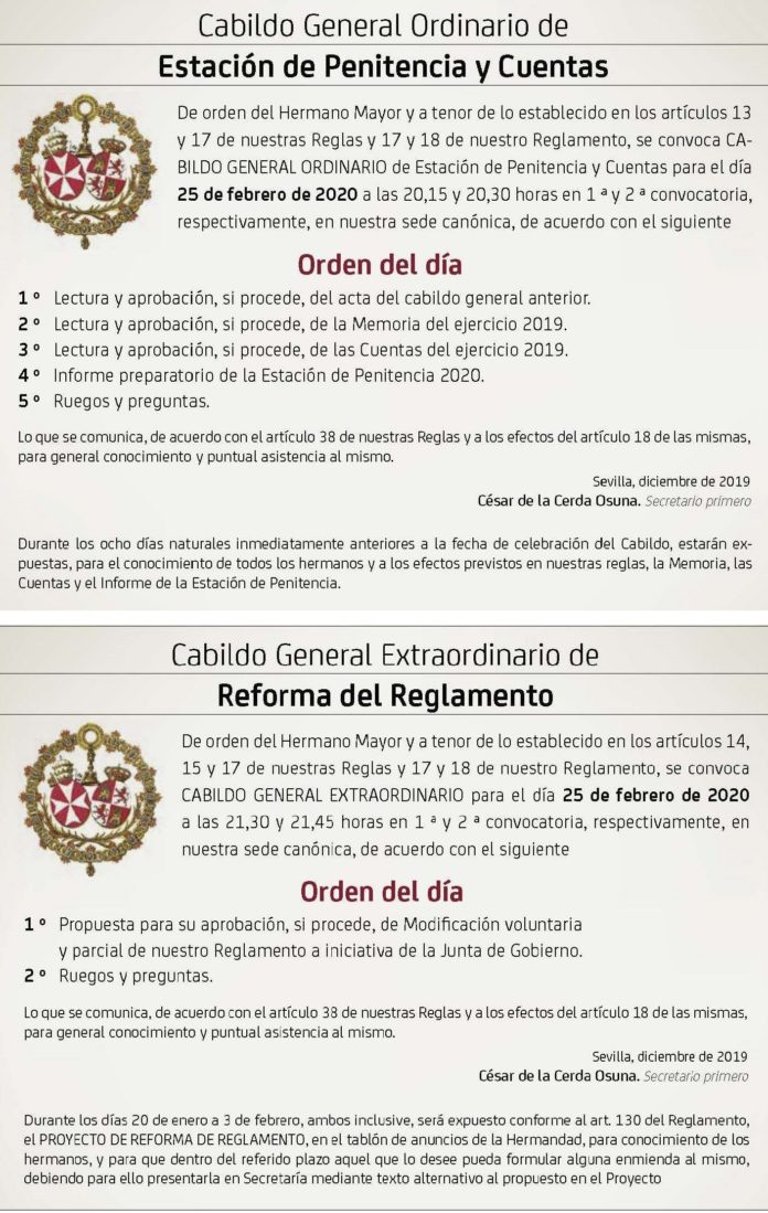 Cabildo General Ordinario de Informe de Estación de Penitencia, Seguimiento de Cultos y de Presupuestos