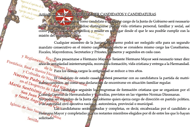 Dicha candidatura ha sido aprobada por el Cabildo de Oficiales celebrado el 25 de junio de 2020, en presencia del candidato a Hermano Mayor, de la Comisión Electoral, con el visto bueno de nuestro Párroco y Director Espiritual D. Jesús Maya Sánchez, y remitida con acuse de recibo a la Delegación Episcopal para Asuntos Jurídicos de Hermandades y Cofradías de la Archidiócesis de Sevilla.
