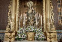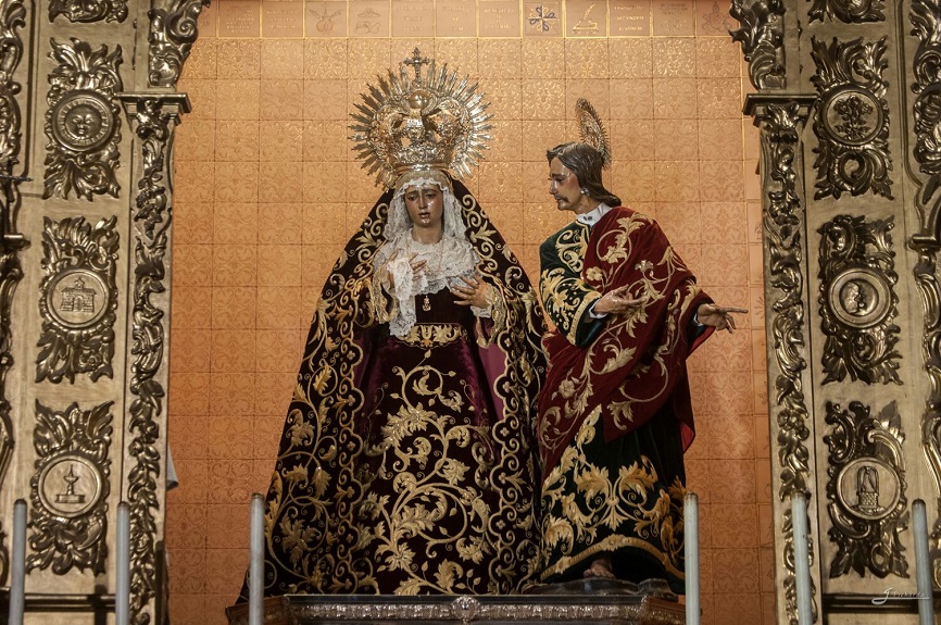 La imagen de la Inmaculada, que preside su altar de la capilla Sacramental de nuestro templo, ha sido retirada del culto temporalmente debido a su cesión para la exposición «Esperanza de la Trinidad. La mirada...