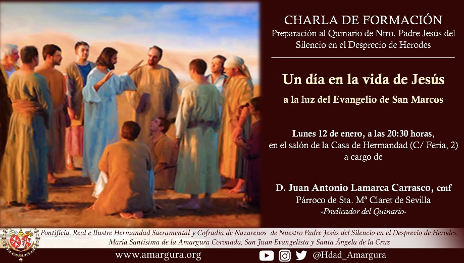 El lunes 12 de enero, a las 20:30 horas, la diputación de formación ha organizado una charla como preparación al quinario de Ntro. Padre Jesús del Silencio. En la misma, que será cercana y breve, podremos mantener un coloquio con el predicador, D. Juan Antonio Lamarca, cmf, y adentrarnos a los pasajes de la Sagrada Escritura que leeremos durante los cultos.