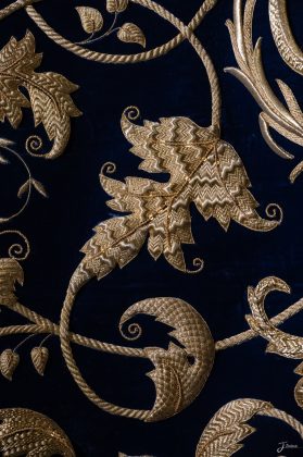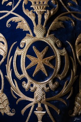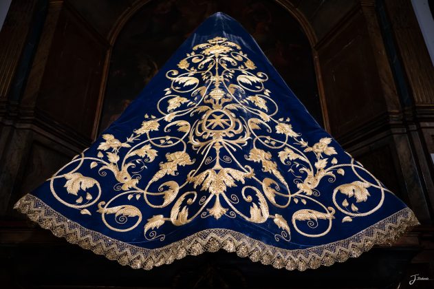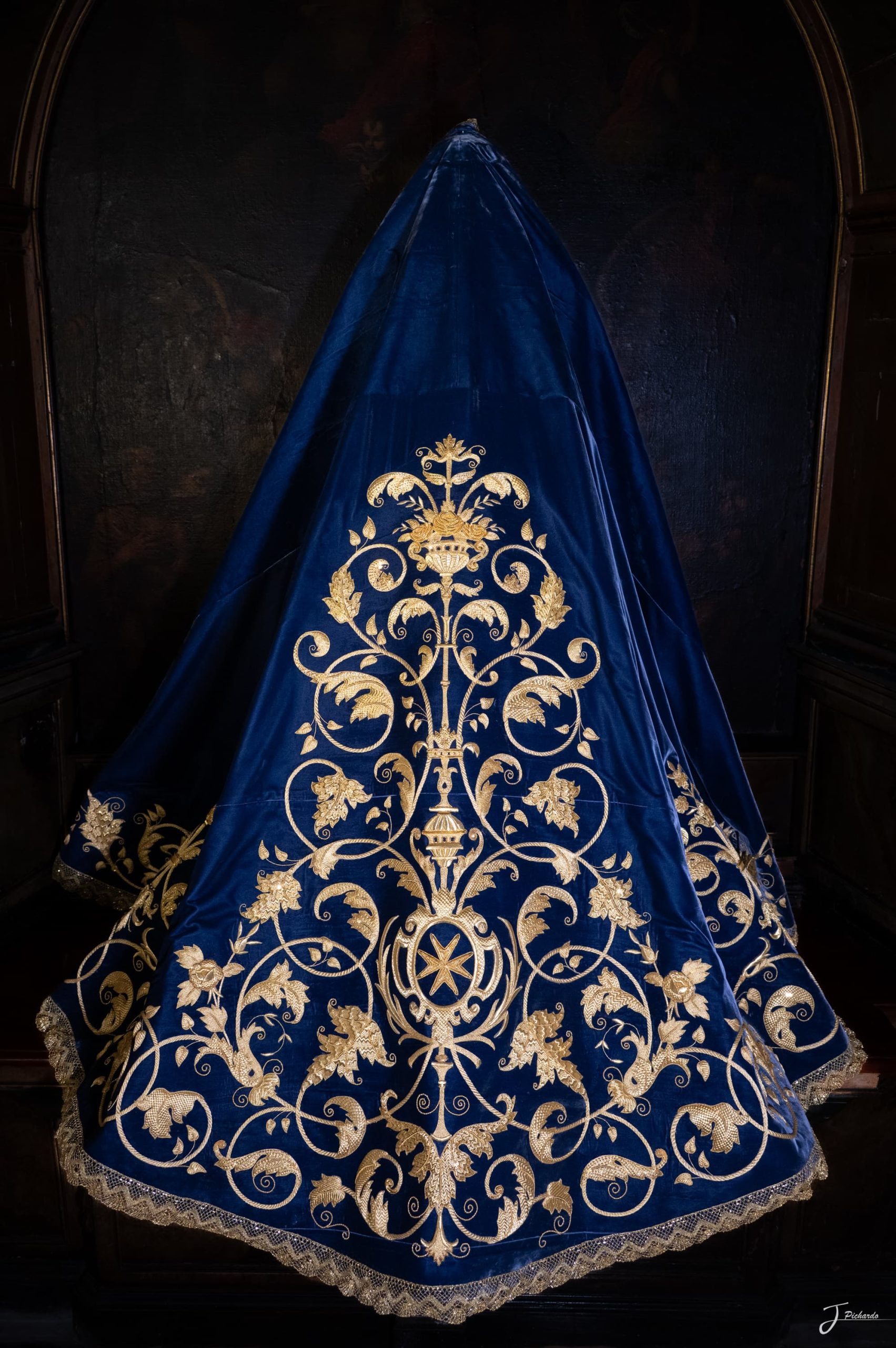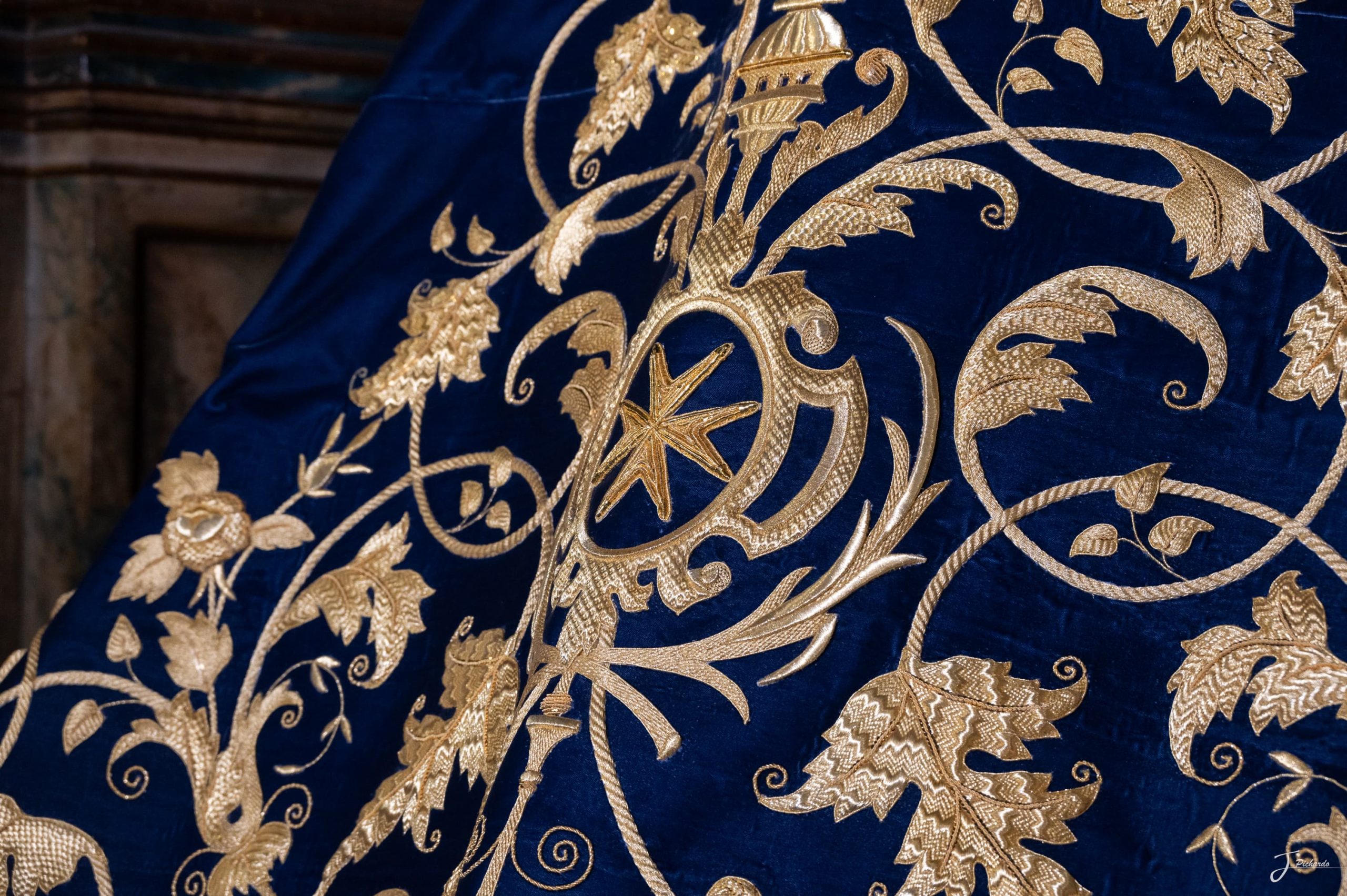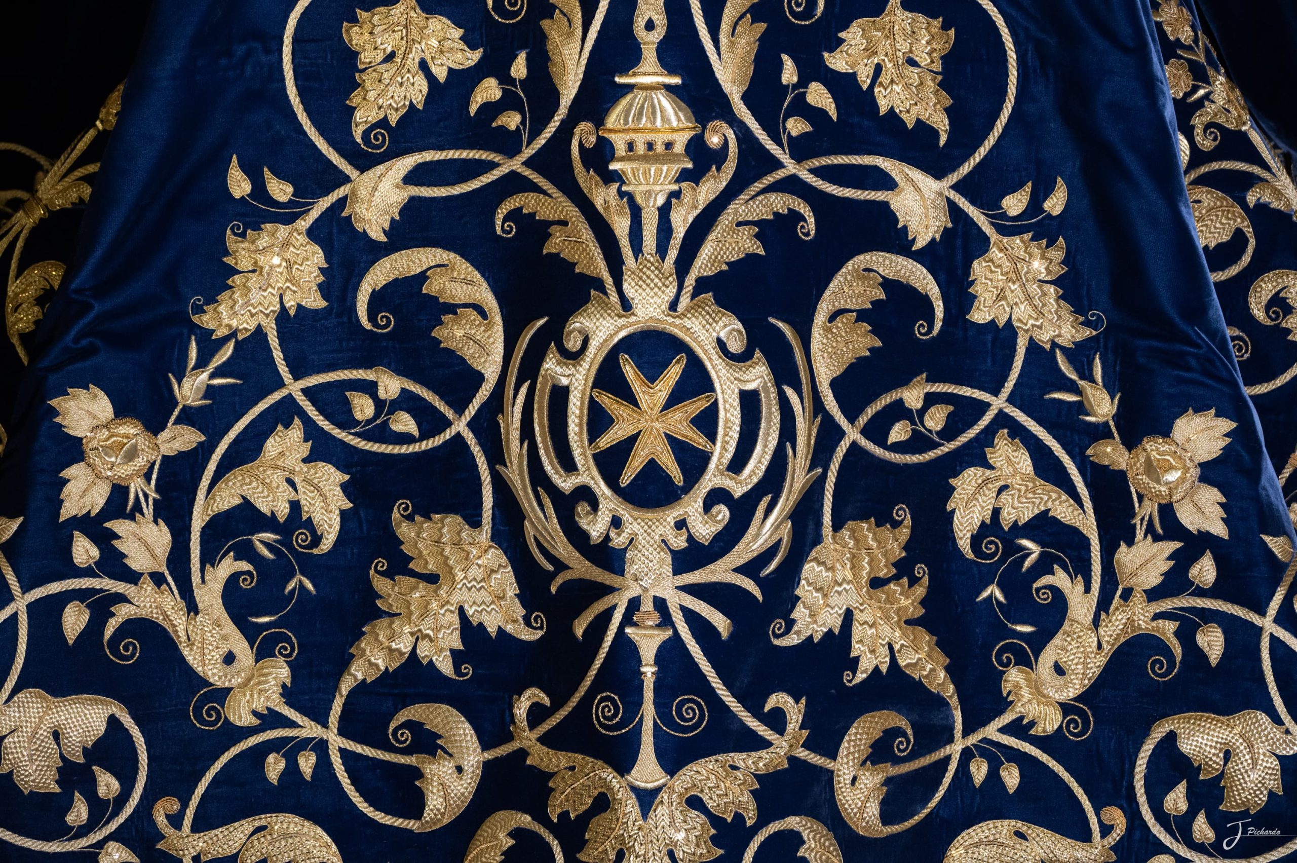 Los bordados, inspirados en los de las distintas piezas de la Hermandad, se centran en el perímetro y la zona central del manto, enmarcando la Cruz de San Juan Bautista como motivo principal en alusión al tricentenario de nuestra corporación en San Juan de la Palma.