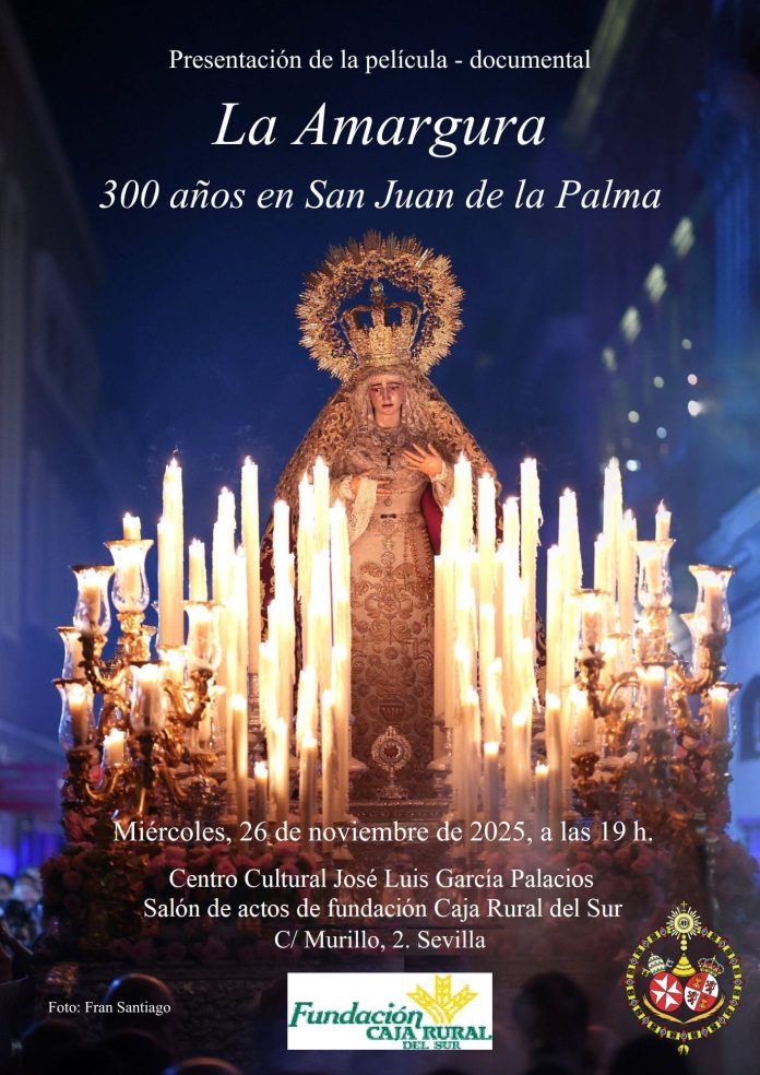 El miércoles 26 de noviembre, a las 19h., tendrá lugar el estreno de la película documental «La Amargura: 300 años en San Juan de la Palma», en el Centro Cultural José Luis García Palacios, en el salón de actos de la Fundación Caja Rural del Sur (Calle Murillo, 2).