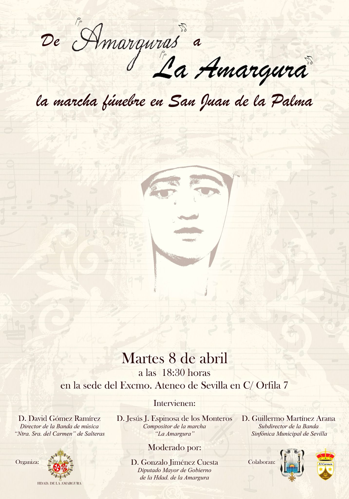 El martes 8 de abril, a las 18:30 h., en la sede el Excmo. Ateneo de Sevilla (C/ Orfila 7), tendrá lugar una mesa redonda bajo el título de “De Amarguras a La Amargura. La marcha fúnebre en San Juan de la Palma”.