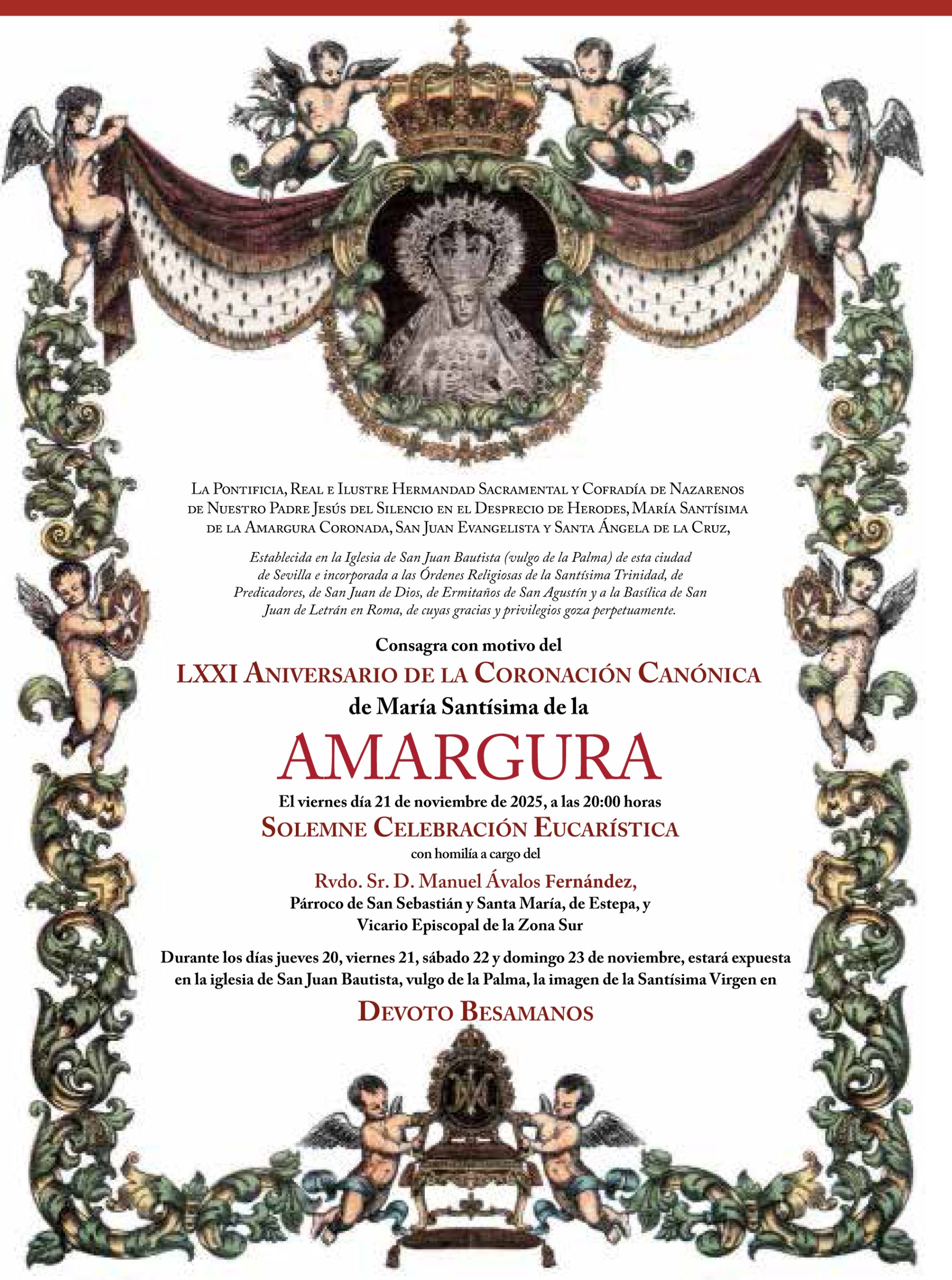 El viernes 21 de noviembre de 2025, a las 20:00 horas, la Hermandad consagrará, con motivo del LXXI Aniversario de la Coronación Canónica de María Santísima de la Amargura, Solemne Celebración Eucarística, celebrando y predicando el Rvdo. Sr. D. Manuel Ávalos Fernández, Párroco de San Sebastián y Santa María de Estepa, y Vicario Episcopal de la Zona Sur