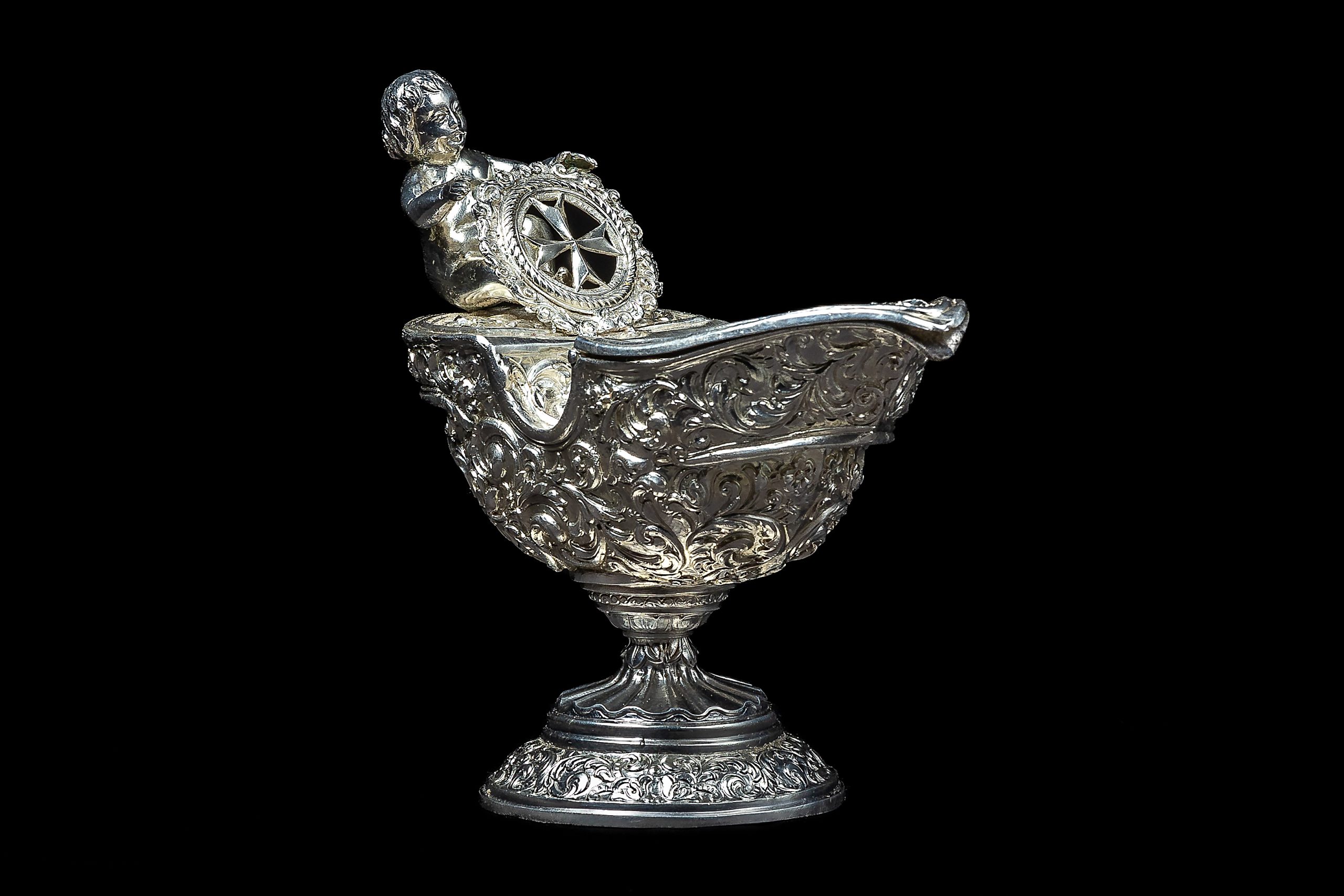 Dos navetas cinceladas en plata de ley. En la parte superior tienen un angelito sosteniendo con sus manos la Cruz de San Juan.