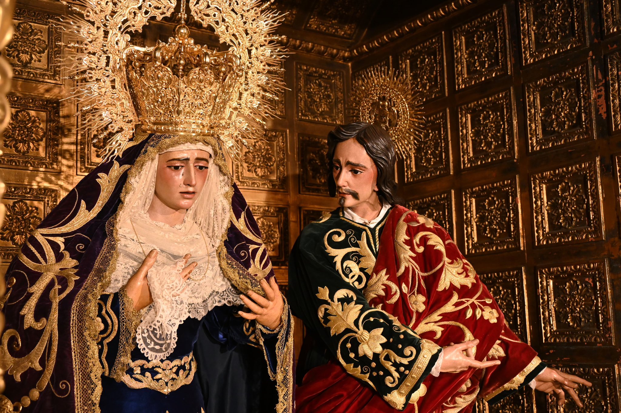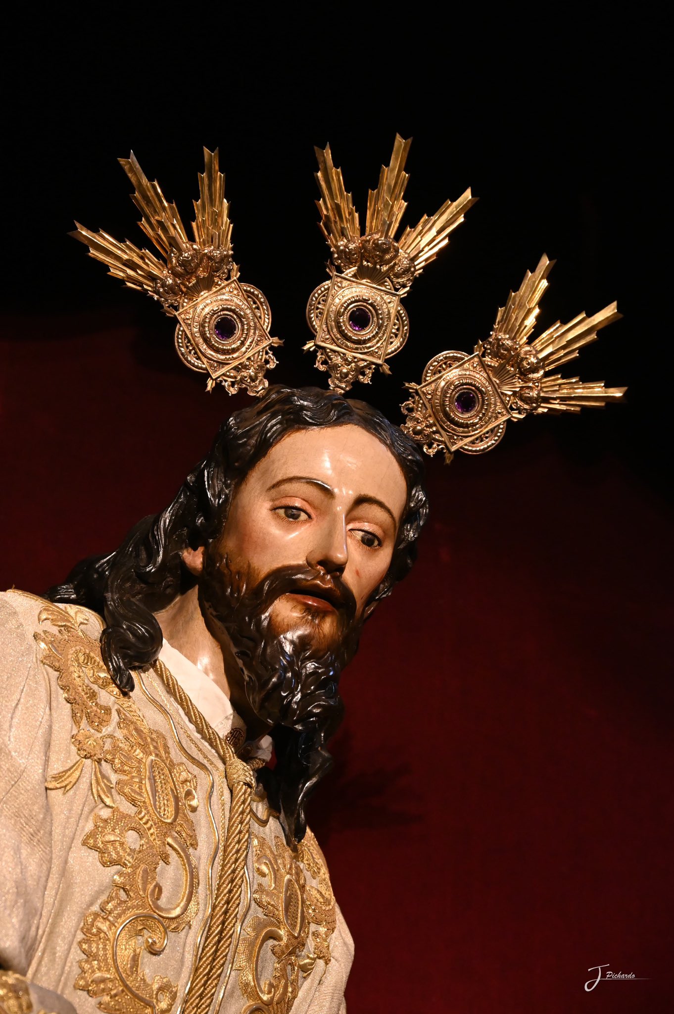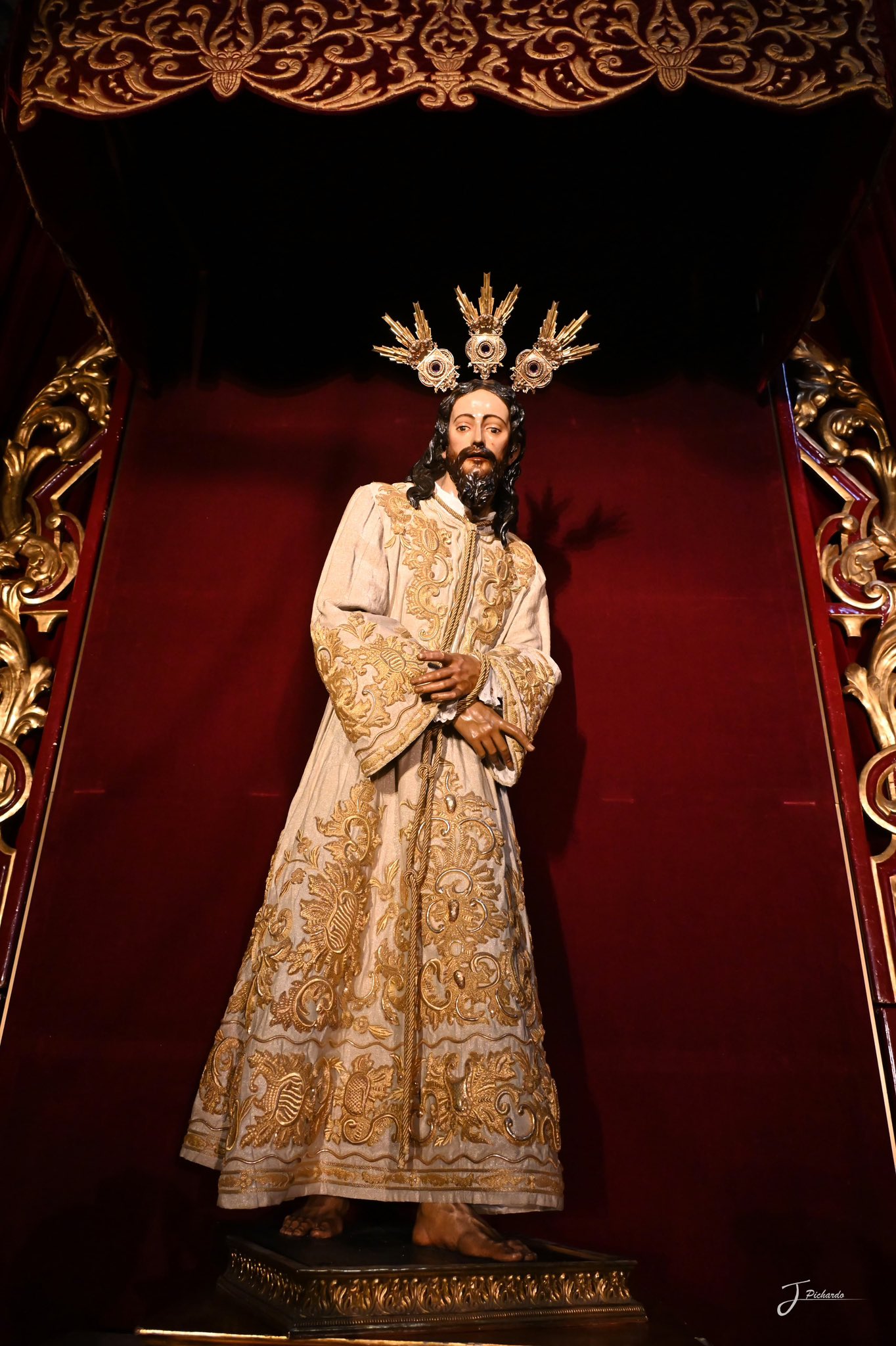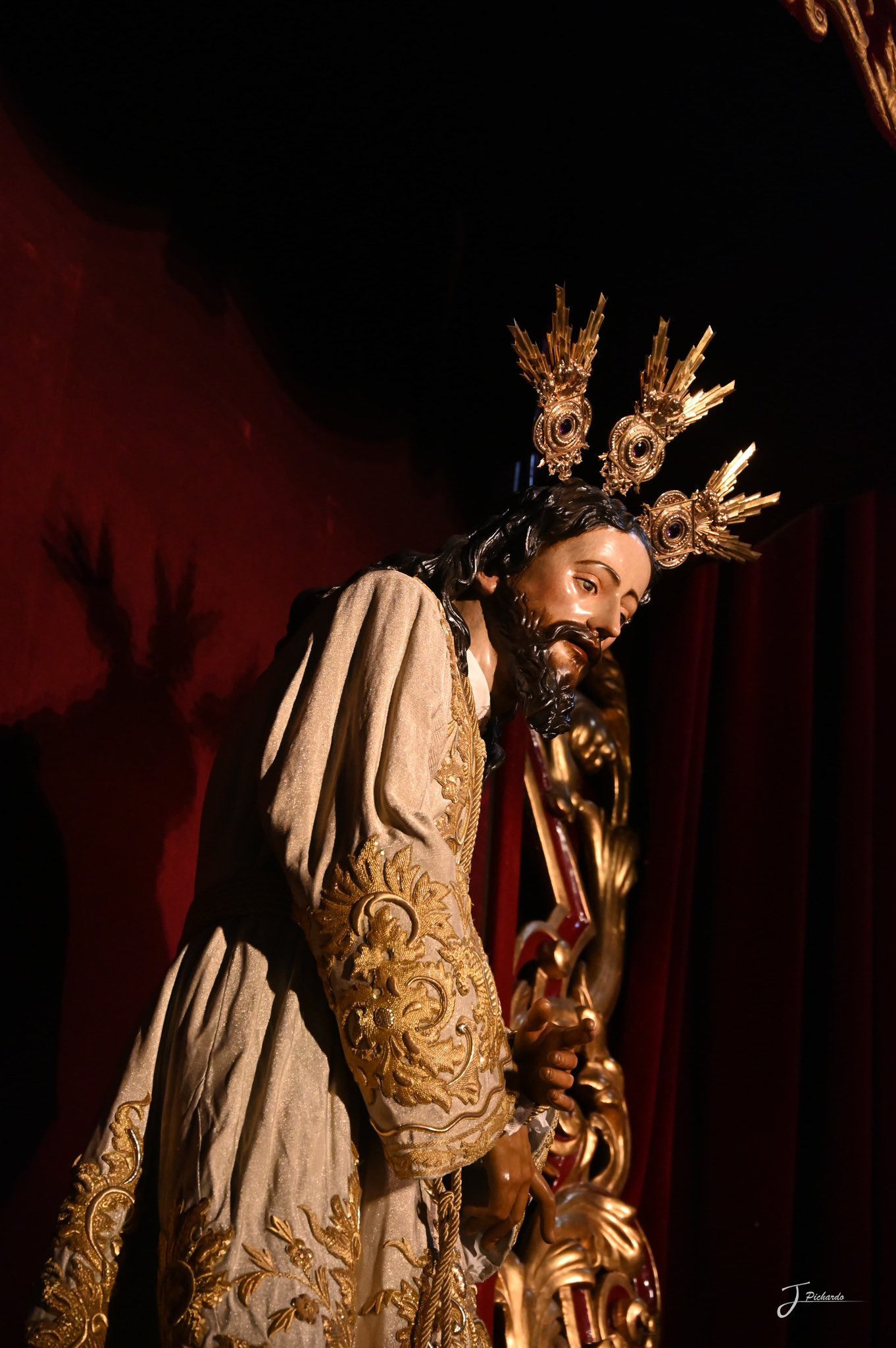 El Señor del Silencio ocupa desde la noche del viernes el altar mayor de San Juan de la Palma, de cara al comienzo del Quinario que tendrá lugar del 14 al 18 y que culminará con la Función Solemne del domingo 19. Con tal motivo ha sido vestido con la túnica de “las rocallas” (1919).