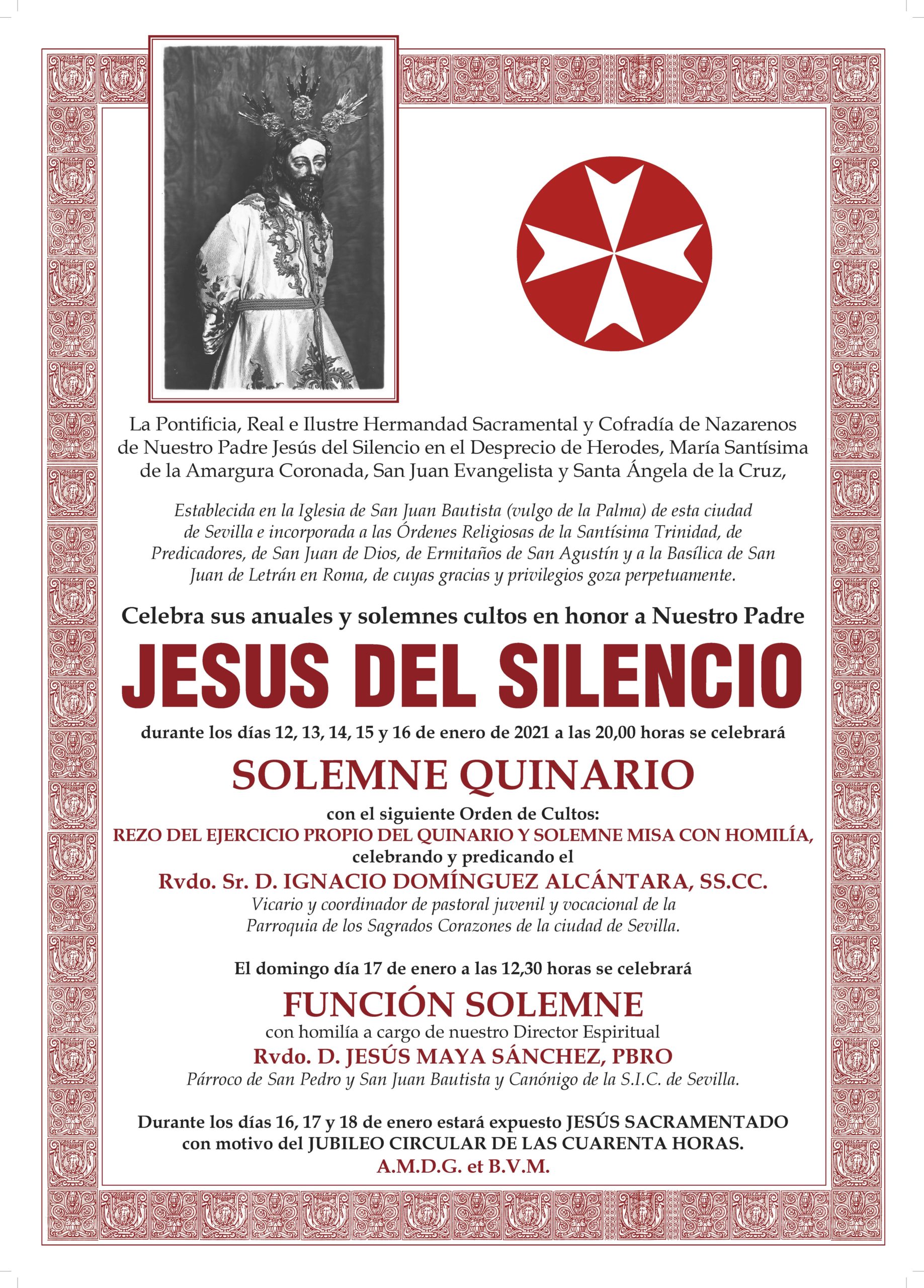 Durante los días 12, 13, 14, 15 y 16 de enero de 2021 a las 20,00 horas se celebrará Quinario Solemne con el siguiente Orden de Cultos: Santa misa con rezo del ejercicio propio del quinario y homilía, celebrando y predicando el Rvdo. P. D. Ignacio Domínguez Alcántara SS.CC. Vicario y Coordinador de Pastoral Juvenil y Vocacional de la Parroquia de los Sagrados Corazones de la ciudad de Sevilla.