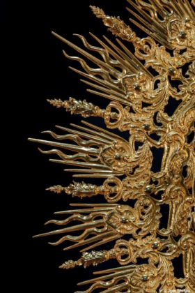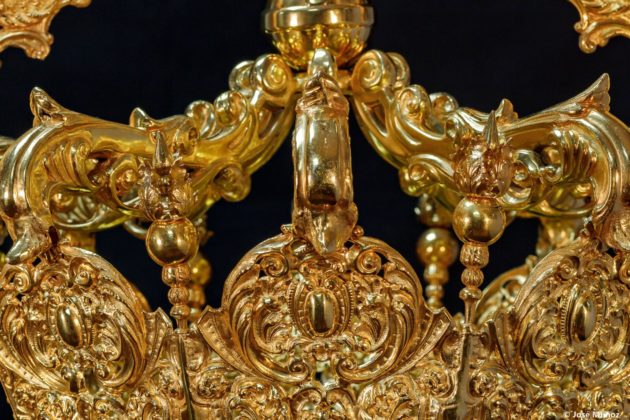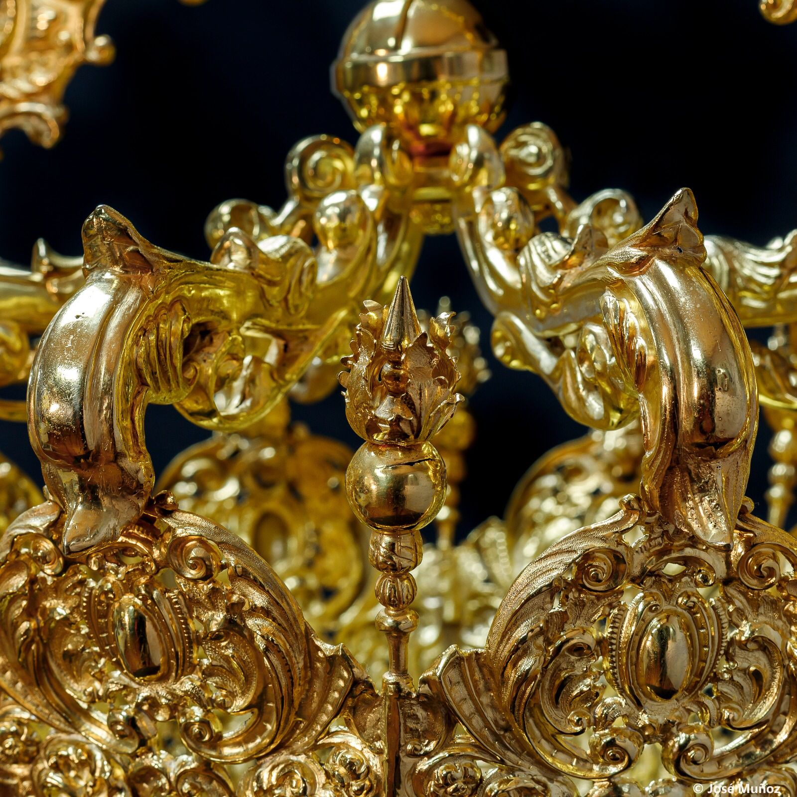 Sobre una portentosa canastilla de marcada forma hexagonal se dividen las secciones donde aparece un mismo motivo decorativo que puede verse repetido en ambas caras. De los vértices y lados nacen sendos imperiales que varían su forma según el punto de arranque, proporcionando una vistosa variación de roleos vegetales en sus perfiles. La llamativa ráfaga se decora con elementos vegetales y pequeños roleos que combinan con piezas caladas, contribuyendo a una notable visión de ligereza en su composición. Los perfiles se rematan con ráfagas mixtilíneas combinadas con piezas que simulan pequeños flameros, aportando una singular forma y delicada belleza.