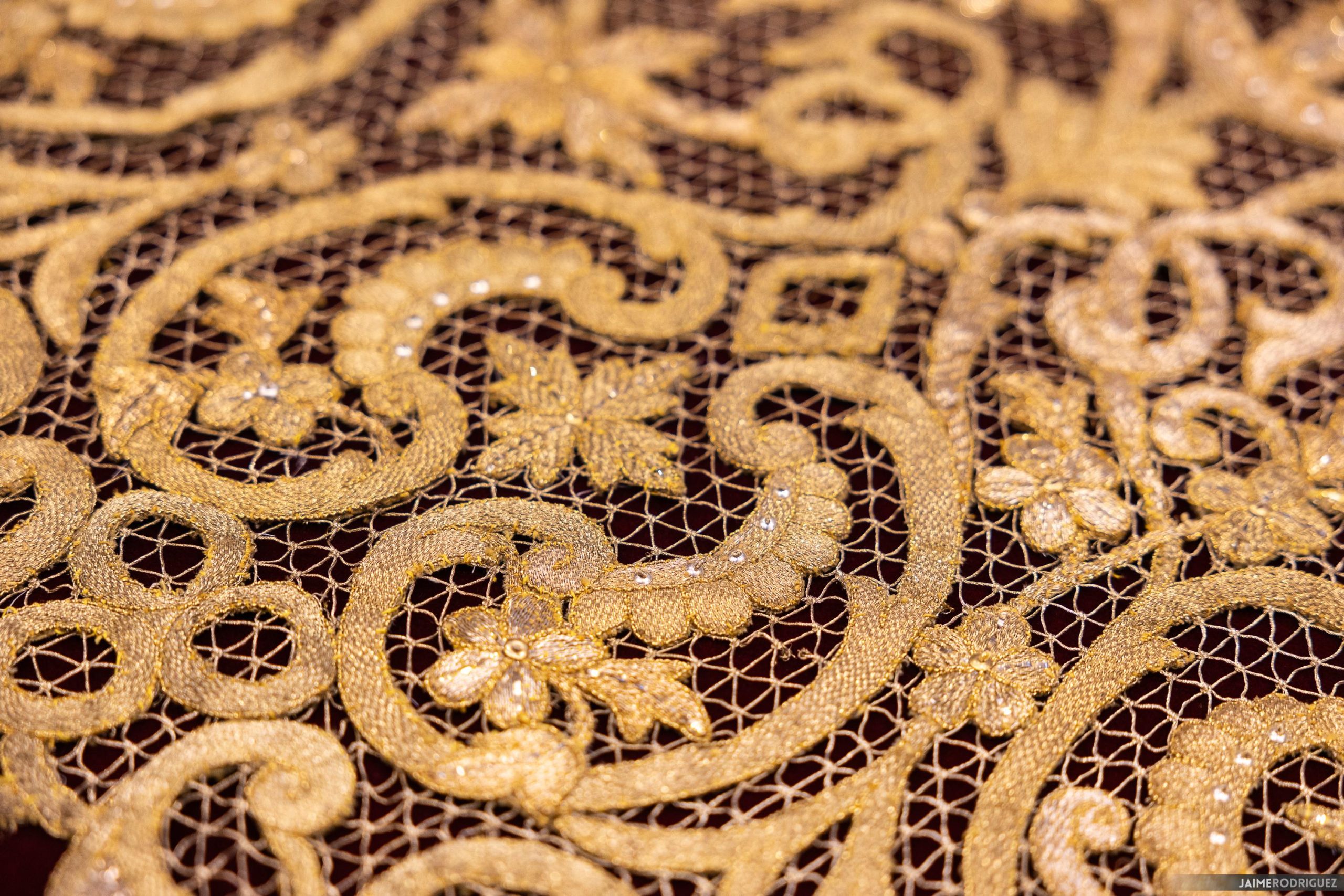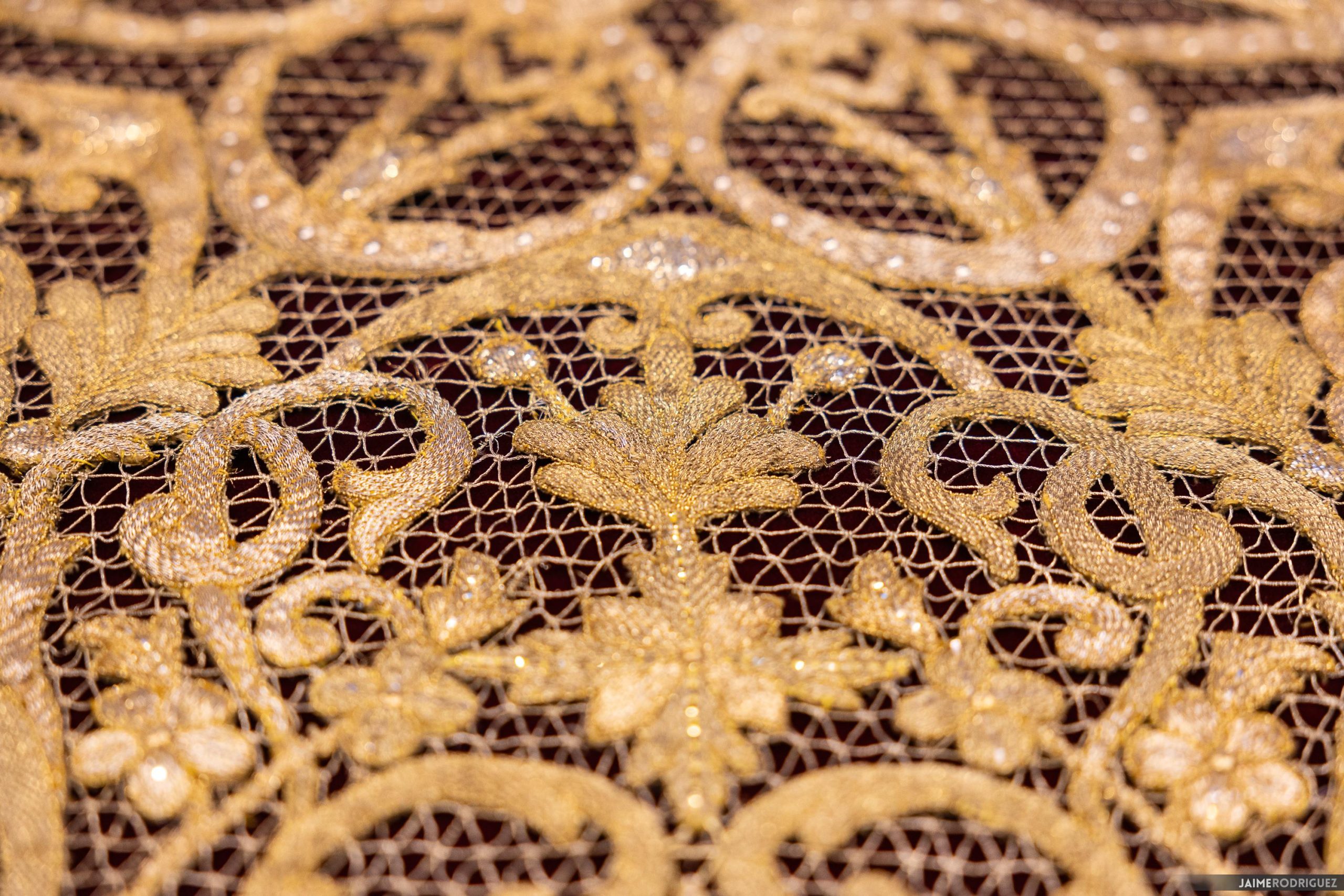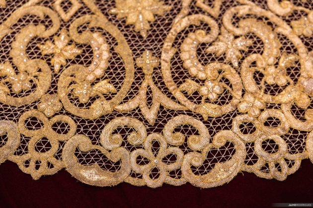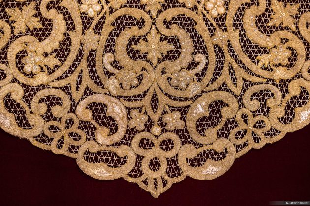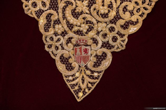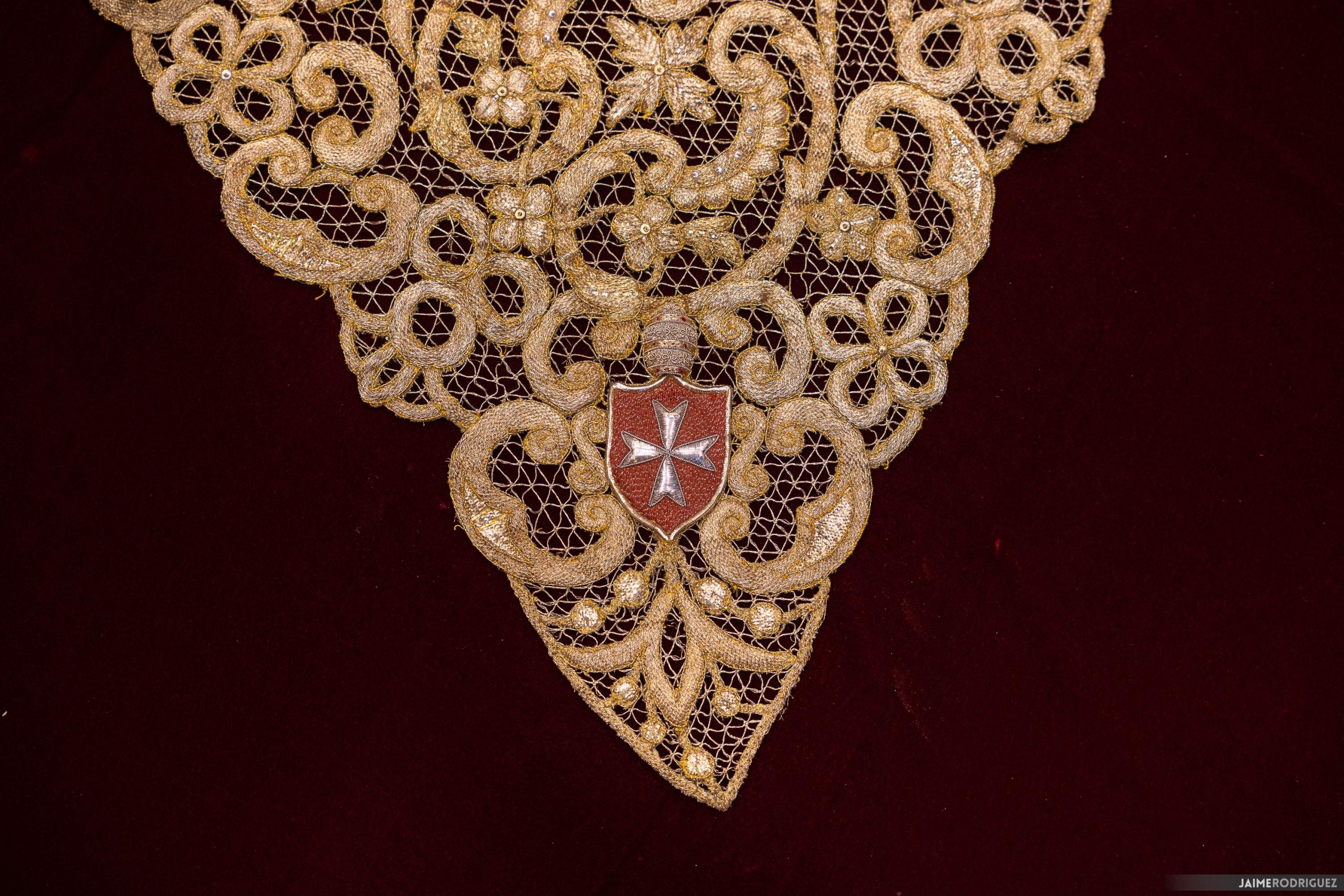Estos trabajos han sido desarrollados por el taller de bordados de las Hermanas Rama, consistiendo fundamentalmente en una limpieza del bordado, el cual se encontraba oscurecido en determinadas zonas. Del mismo modo, se han resanado hilos y diferentes zonas que presentaban cierto deterioro como fruto del paso del tiempo.