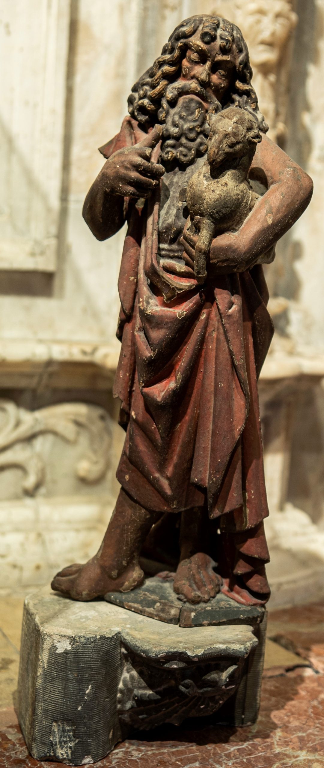 Su cabeza muestra una importante melena con largos mechones de cabello, así como un desarrollado bigote y una barba muy poblada, y todo, con un importante trabajo de gubia. Tiene los ojos cerrados y almendrados, nariz aguileña y huesuda, pómulos y arco superciliar muy marcado y boca amplia. Los brazos y piernas no están muy anatomizados y viste una túnica y sobre ella, un mantolín rojo con pliegues duros y rígidos propios del naturalismo gotizante de dicha centuria; dicho mantolín rojo, es símbolo del martirio sufrido al ser degollado. Lleva bajo su brazo izquierdo al Cordero Divino, el cual, mira de frente al espectador y muestra unos rasgos igualmente esquemáticos. Dicha imagen, posee una peana en piedra de reducidas proporciones donde aparece un querubín en la parte central.