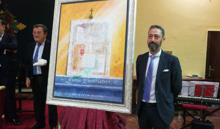 El Consejo de Cofradías ha presentado en la sede del Real Círculo Labradores el cartel del Junio Eucarístico 2018, un óleo sobre lienzo de 130 x 98 centímetros, obra realizada por nuestro Hermano Mayor, José María Pedernal Álvarez, en la que a través de las convocatorias de cultos que se colocan en las fachadas de los templos nos transmite que ayer, hoy y siempre es momento para fomentar la devoción al Santísimo Sacramento.