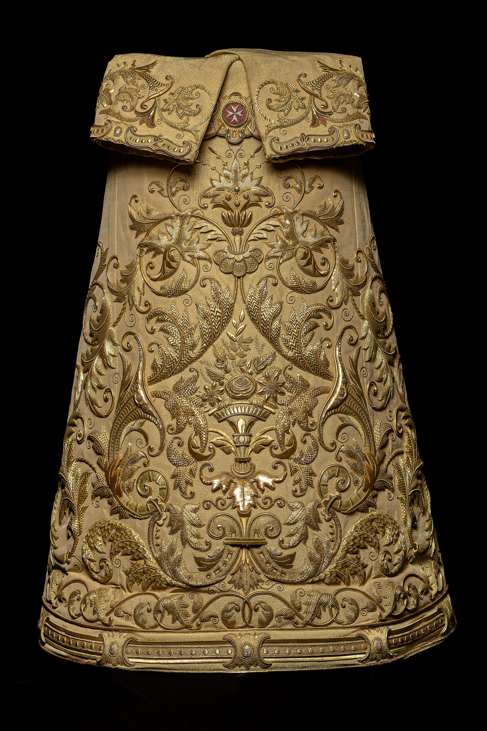 Copia de una saya realizada por Juan Manuel Rodríguez Ojeda en 1904. Bordada en hilo metálico dorado sobre tisú de oro. Los bordados han sido enriquecidos con más técnica de punto de hojilla y otros puntos de bordado.