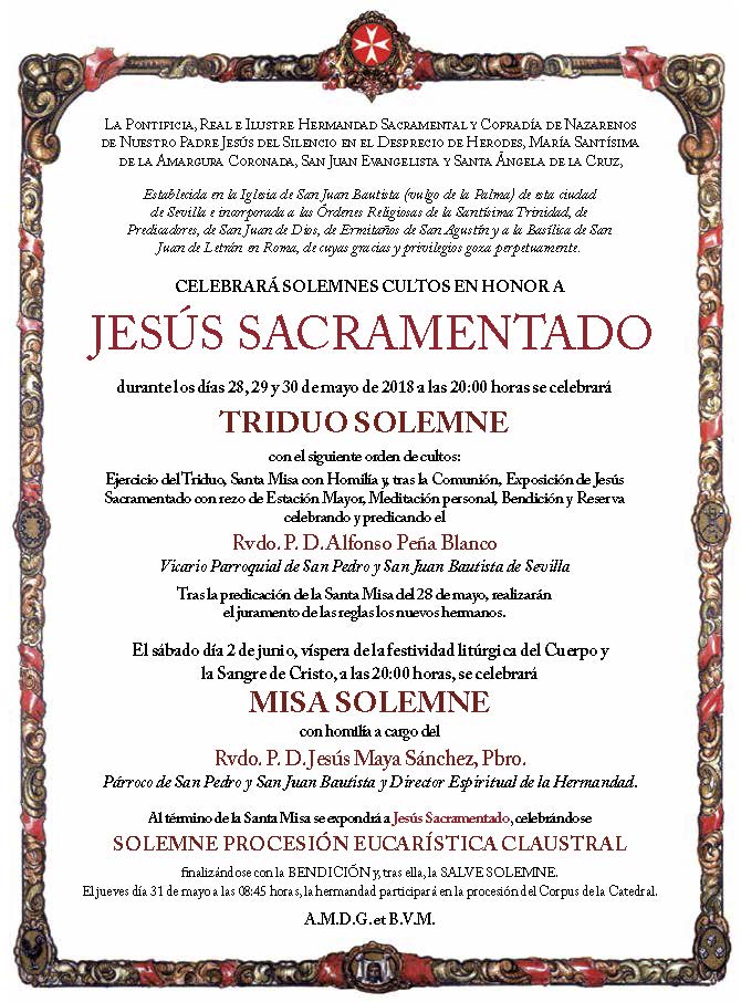 Durante los días 28, 29 y 30 de mayo de 2018, a las 20:00 h., se celebrará Triduo Solemne en honor a Jesús Sacramentado con el siguiente orden de cultos: