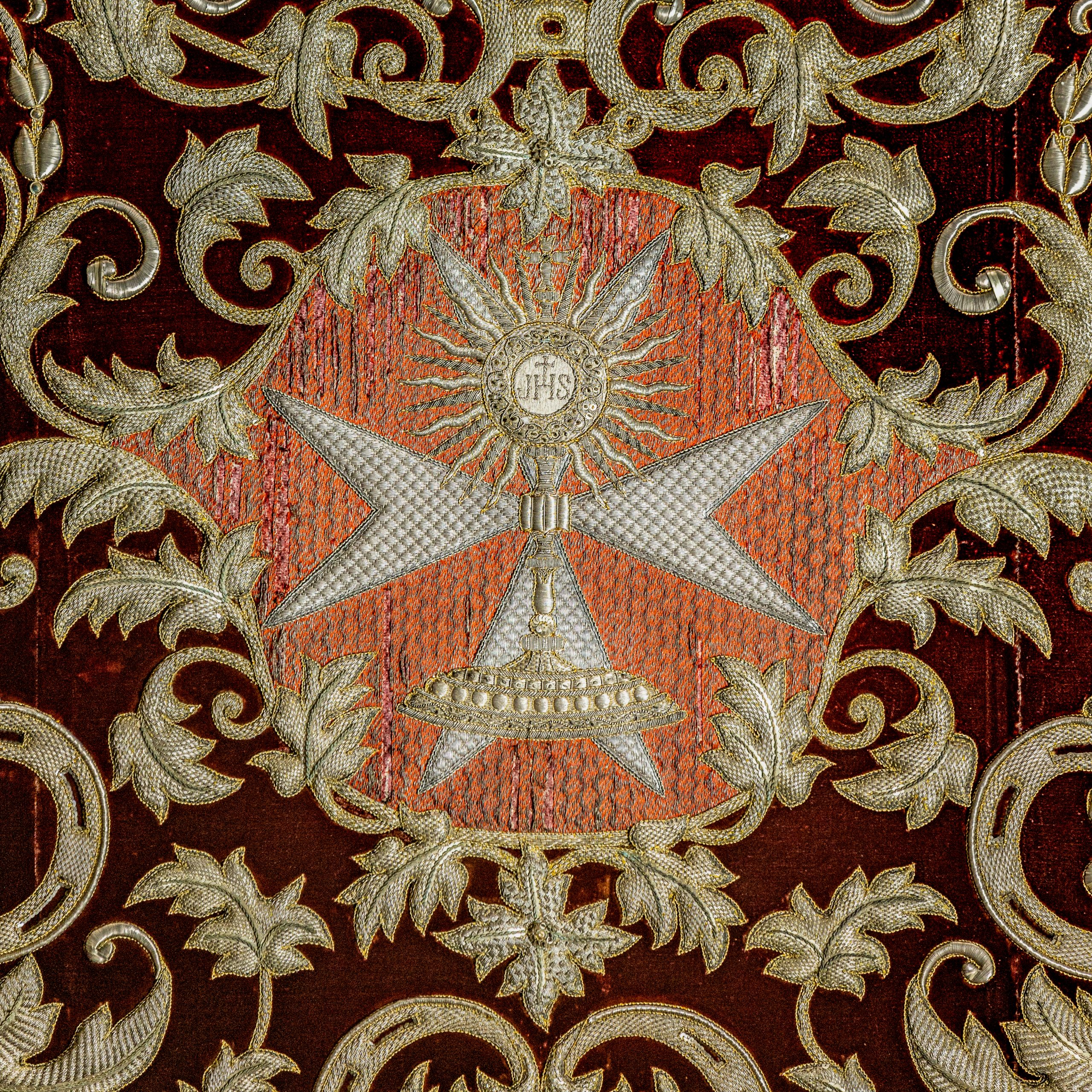 Al frente, a los pies y a cada lado de la gloria aparecen bordados en seda de colores y oro los siguientes escudos: de la Hermandad, de Sevilla, de Asturias (por ser hermano el príncipe) y los de las cuatro ordenes religiosas a las que está adscrita la Hermandad (San Juan de Dios; Agustinos; Dominicos y Trinitarios).El escudo de la Hermandad no presenta la heráldica completa sino que escoge la Cruz de Malta que nos distingue y sobre ella destaca el Viril haciendo referencia al carácter Sacramental de la corporación.