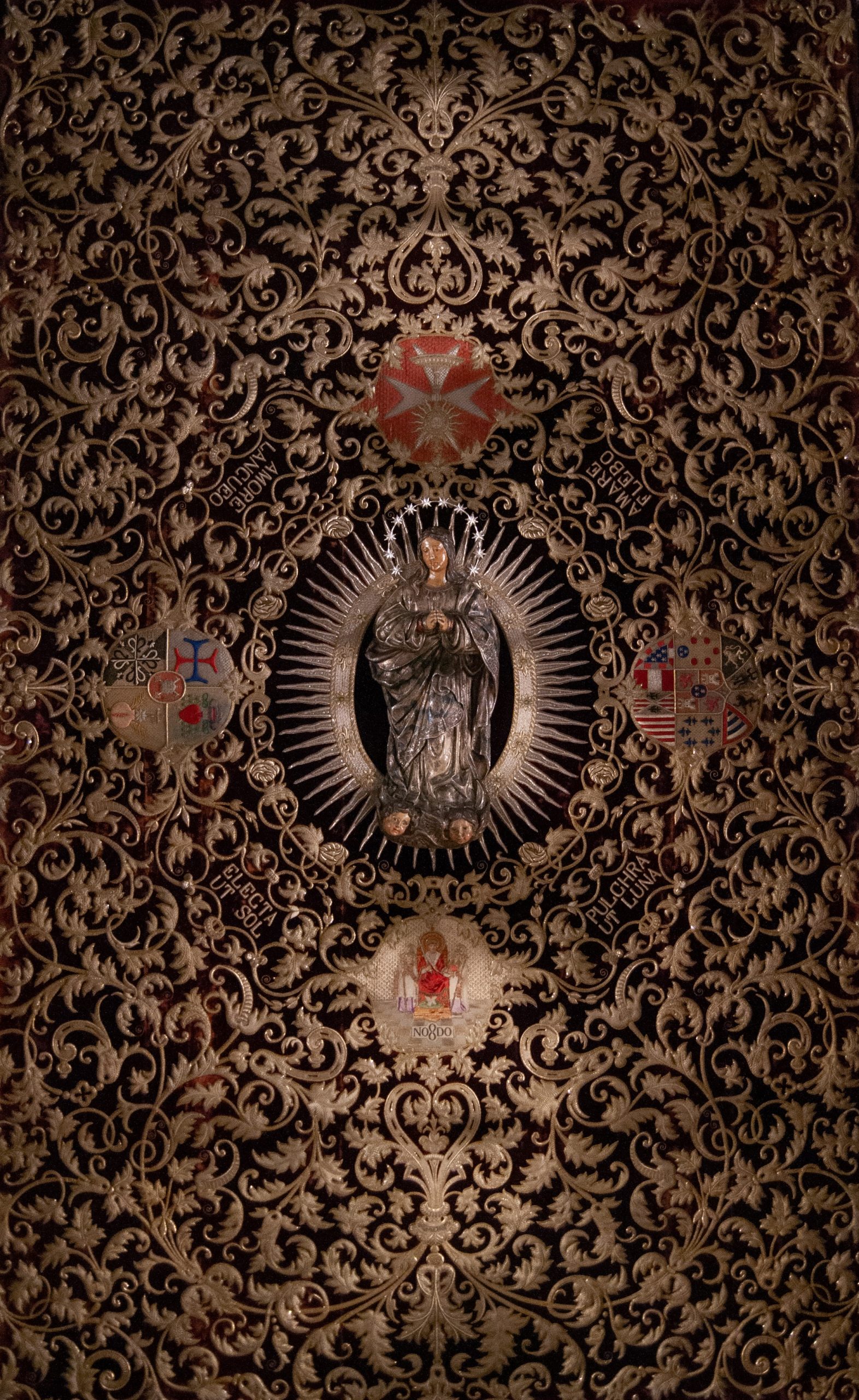 Además aparecen entre estos escudos y bordados en oro los siguientes lemas marianos: