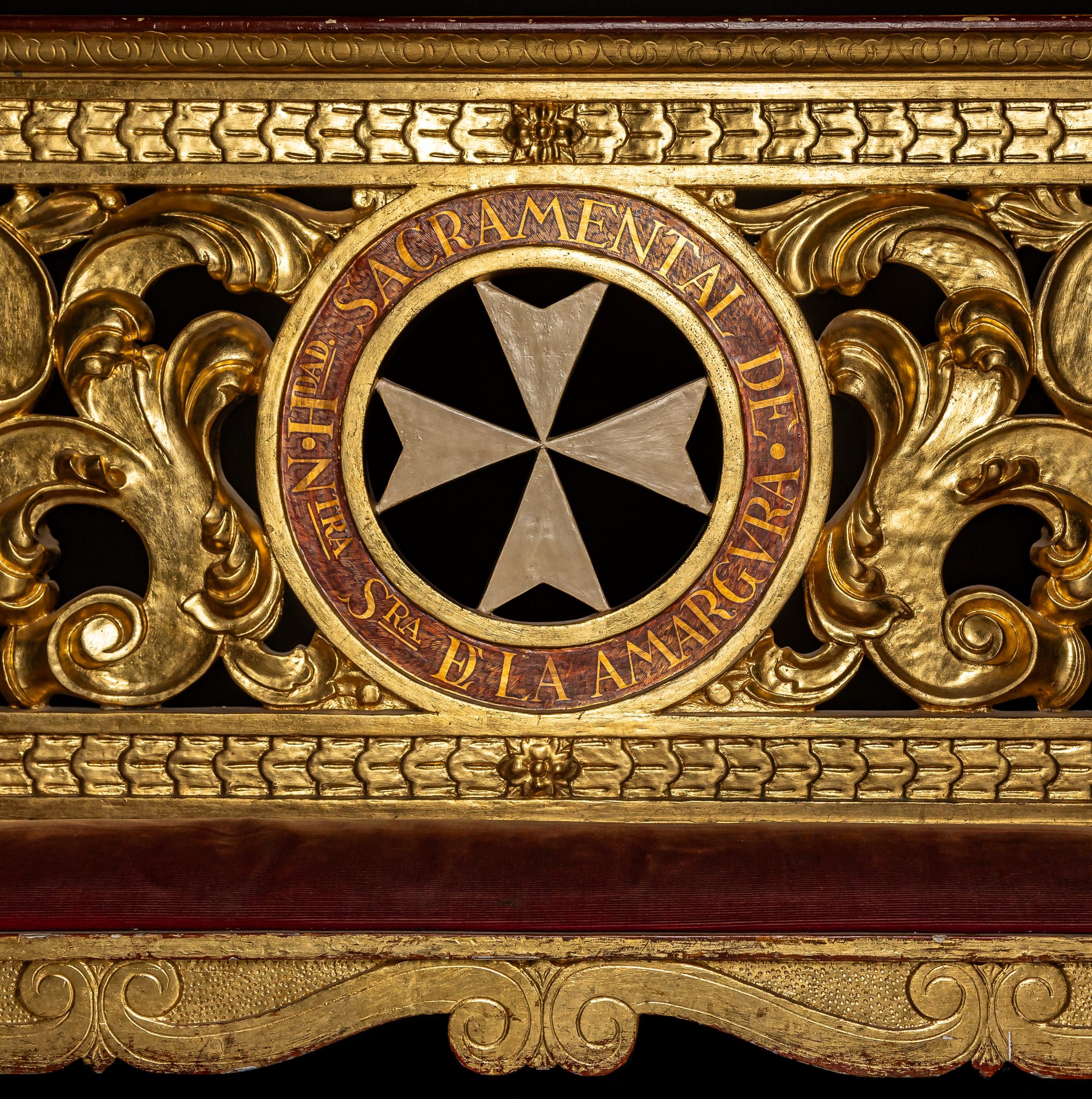 De claro diseño barroco, dibujado por nuestro prioste D. Rafael Rodríguez Hernández y cuyo reclinatorio esta forrado de terciopelo granate. En el centro de toda la hojarasca barroca, probablemente inspirada en los arbotantes del dosel de Farfán propiedad de la hermandad, una gran cruz de malta en colores blanco y rojo con la leyenda: Hermandad Sacramental de la Amargura. En 1962, una vez realizada la obra de la iglesia e instalado el retablo que se trajo de Carmona para que la Virgen de la Amargura presidiera el templo de San Juan Bautista, se encargó este magnífico reclinatorio o comulgatorio que se situó en el presbiterio delante de la mesa de altar. Actualmente se encuentra en la capilla Sacramental delante del sagrario.