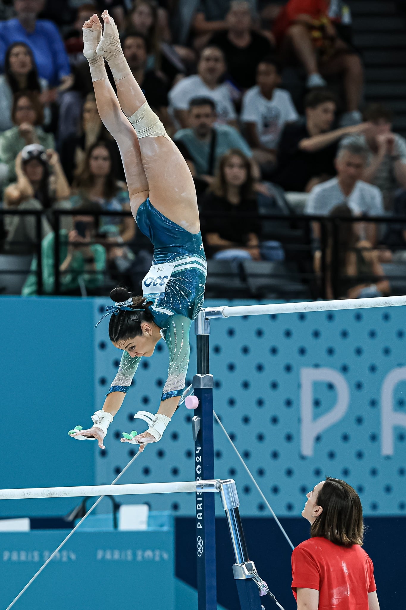No, la foto no está al revés. Es NH Ana Pérez en el ejercicio de suelo de la competición de Gimnasia Artística de los JJOO de París. Un sueño al alcance de pocas y una historia de superación.