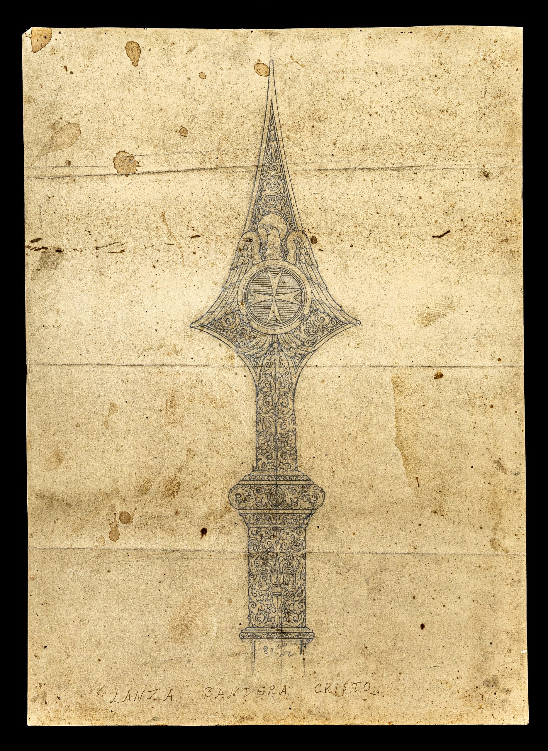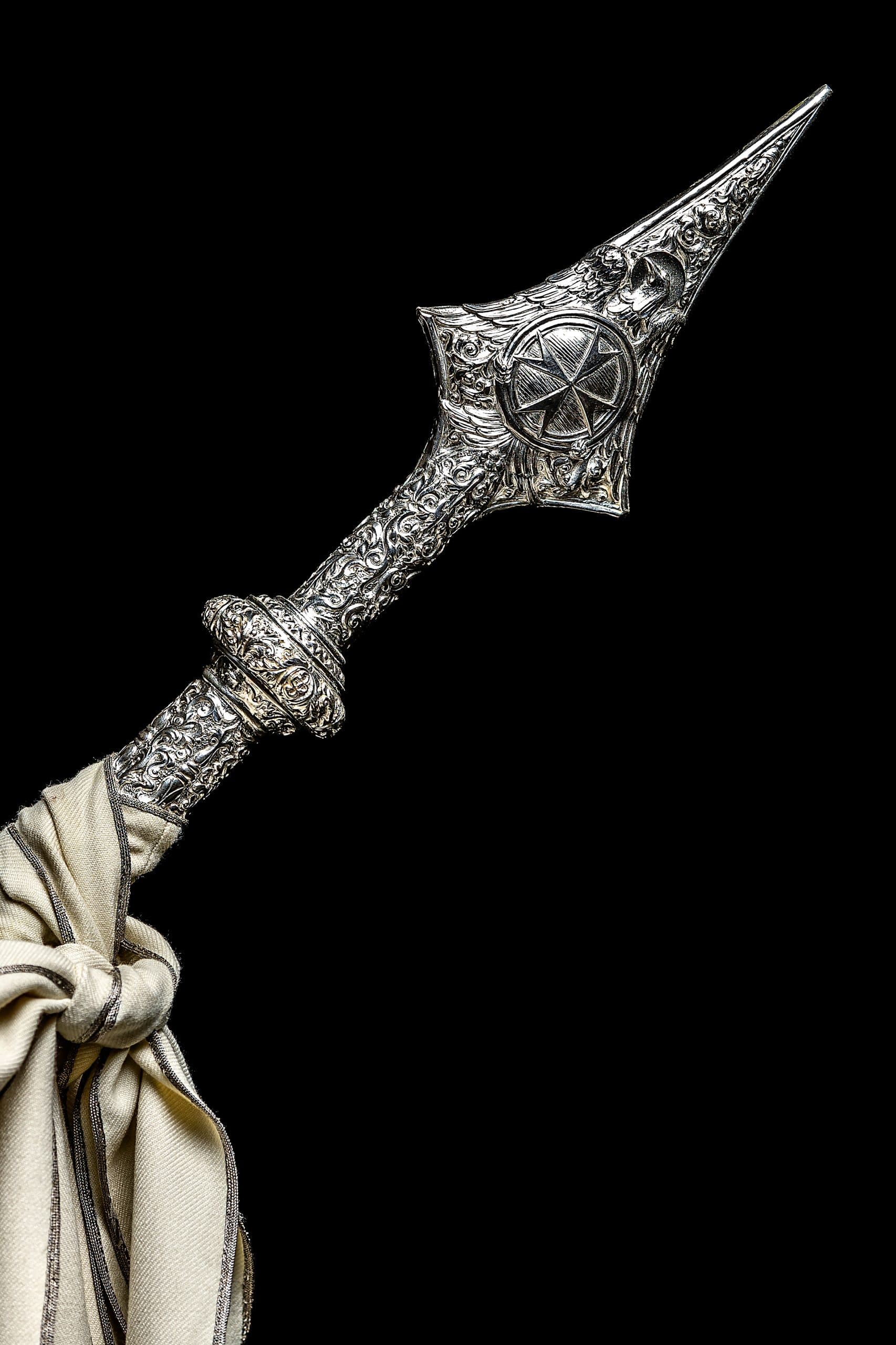 El remate de la bandera blanca es una lanza repujada realizada en 1947 por Fernando Cruz Suárez. Como el resto del asta su dibujo se debe a Antonio Cobos Soto y en la misma están cinceladas unas imágenes de las Sibilas (Líbica, Eritrea, Delphica y Cuma), figuras de la mitología pagana que aludieron a la Pasión de Jesús.