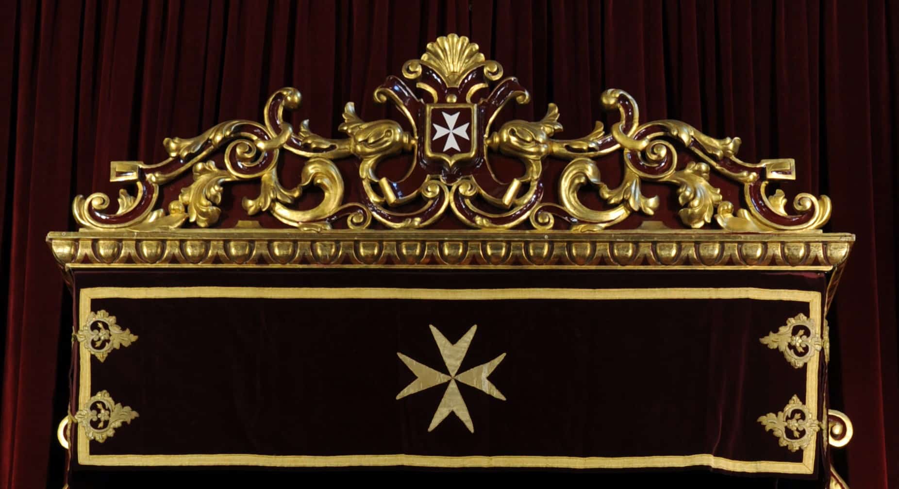 De terciopelo granate en forma de cajón, con galones dorados, una cruz de malta en recorte de tela de tisú en el centro y cerrando, en los laterales, los antiguos broches de los faldones del paso del Señor. Se utilizan como alternativa de las otras goteras existentes para el dosel grande de Farfán. Se mandó su confección siendo prioste D. Francisco de Pineda y Molet.