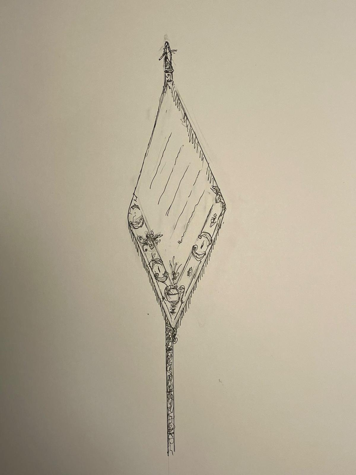 Conforme al boceto que se ha presentado, la insignia sería una bandera similar a la Concepcionista en cuanto a su forma, pero sobre fondo blanco (color litúrgico principal de la Virgen, y que además recupera el de otras insignias clásicas de la cofradía). En el centro, la cita evangélica del Libro de Rut a modo de leyenda en letras bordadas, quedando el texto enmarcado en una guardilla o cenefa, con asta de plata rematada en algún motivo relacionado.