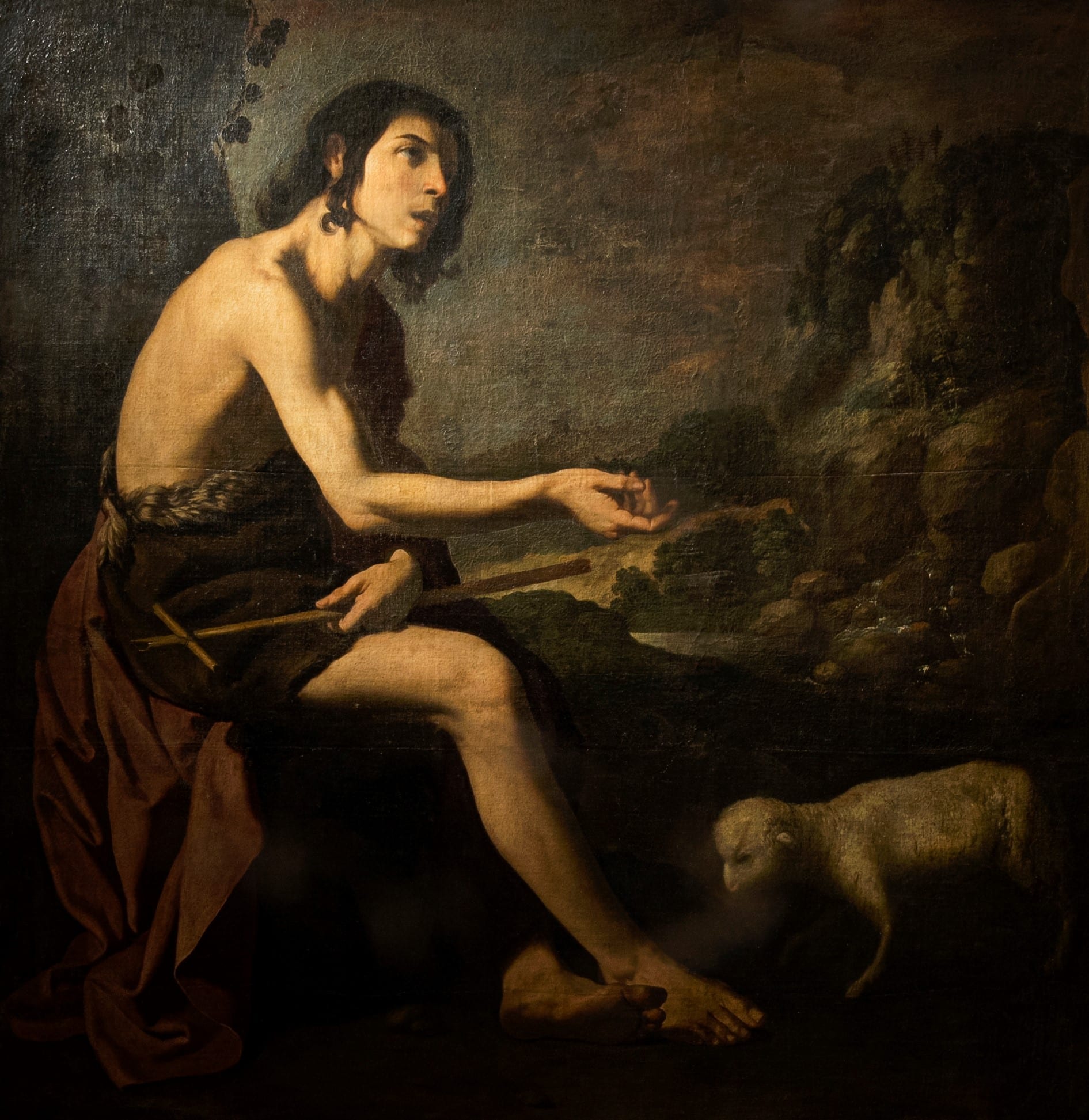 En el caso de la obra que nos ocupa, el maestro de Fuente de Cantos representa un San Juan adolescente de rostro imberbe y sedosas guedejas, sentado sobre una roca, sosteniendo la cruz y acompañado por el cordero a sus pies. Al disponerlo de perfil se permite admirar un magnífico estudio anatómico a través de las lagunas que deja la piel de camello y el manto rojo. Efectivamente, el hombro y brazo derechos y parte del torso y las piernas quedan al descubierto y esto hace que la figura emerja de una misteriosa penumbra ambiental que deja entrever un fondo de paisaje en el que destacan, por un lado, el verde de las arboledas, con el gris rocoso de la peña que se abre, el del quedo y frío estanque y el de las nubes envolventes. Esta manera de representar al santo fue criticada por Interián de Ayala, que no era partidario de hacer del Precursor de Cristo en su faceta de ermitaño un modelo de excusa para los artistas a la hora de mostrar desnudos y medios desnudos.
